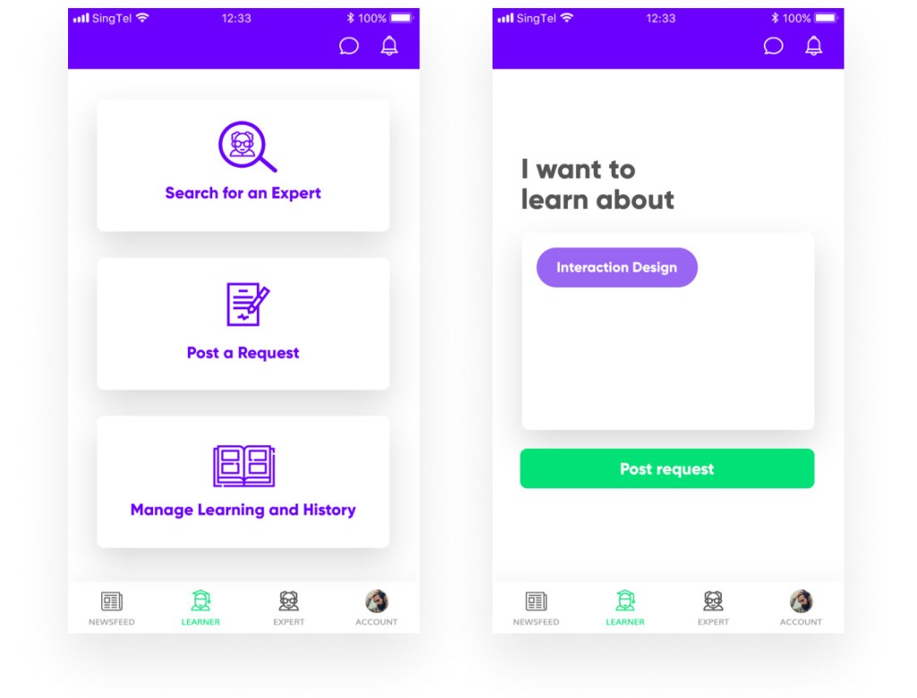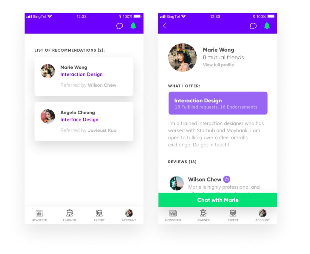 As the learner, you send requests for experts to your friends, to learn any skill when you need it. They can then recommend their friends to improve your skills and knowledge.