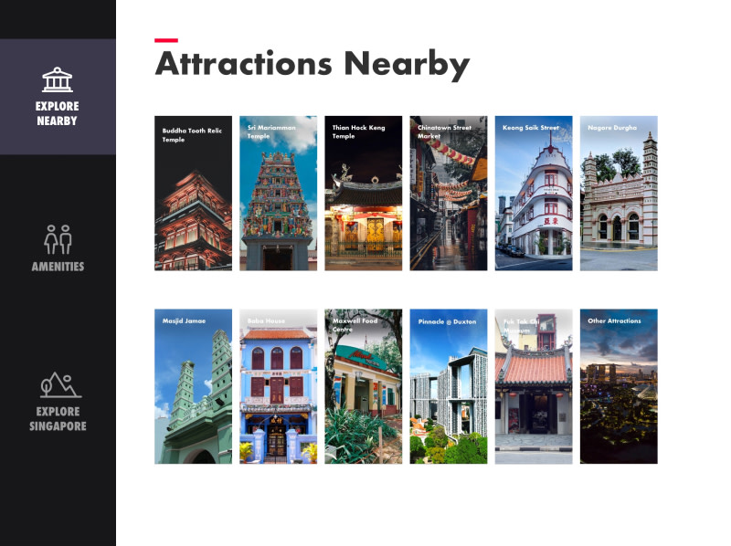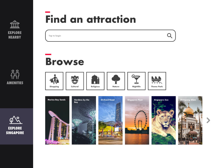 Visitors to Singapore often don’t know how far places are from each other. Each display has unique content, showing the attractions within walking distance for their immediate attention.